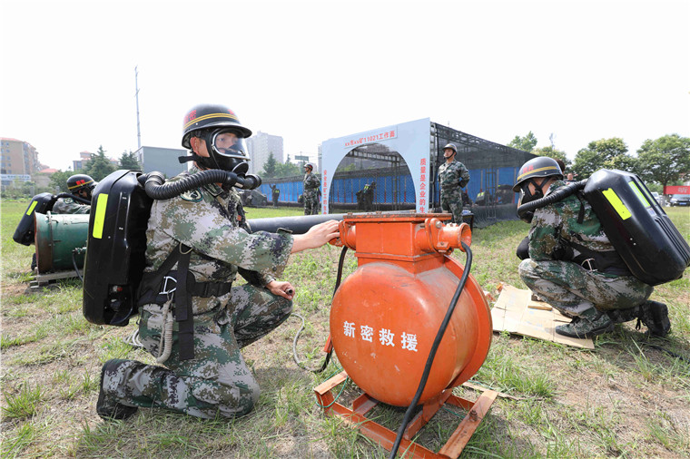 2020年6月14日,新密市民兵应急分队组织矿难救援演练,恢复坑道通风。
