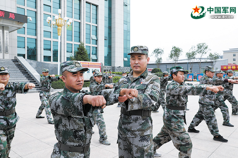 张春生(右一)为定襄县民兵应急分队队员纠正擒敌拳动作。冯利勇摄