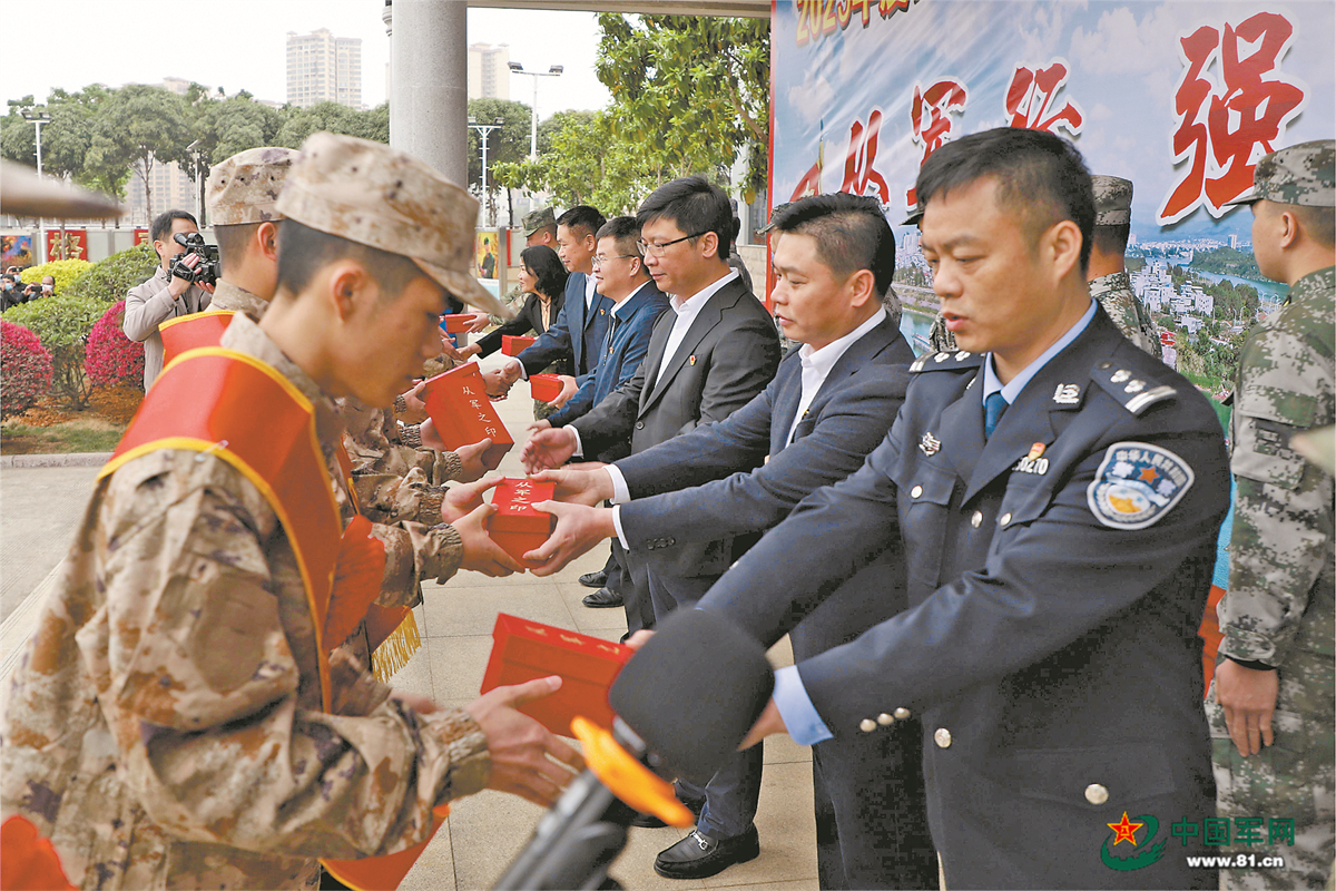 中国国防报讯 陈周全、黄涛报道:3月中旬,广西武宣县举行2023年度上半年新兵入伍批准大会暨“从军之印”赠授仪式。胸戴红花、肩披绶带的入伍新兵,从军地领导手中接过个人专属印章后,踏上开往军营的列车。