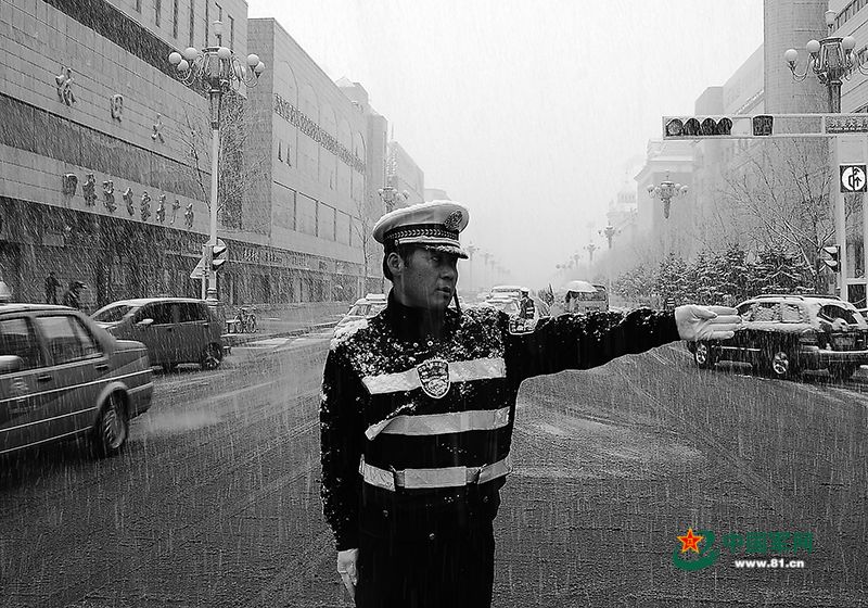 雨雪天,牟清元在“一号交通岗”上执勤。张 波摄