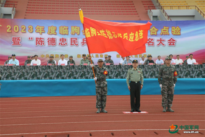“向‘陈德忠民兵应急连’授旗!”5月24日,山东省临朐县基干民兵集合点验暨“陈德忠民兵应急连”命名大会举行,600余人参加。