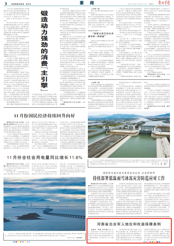 解放军报讯 刘梦、张宇恒报道:近日,河南省第十四届人民代表大会常务委员会第六次会议审议通过《河南省军人地位和权益保障条例》(以下简称《条例》),自2024年1月1日起施行。