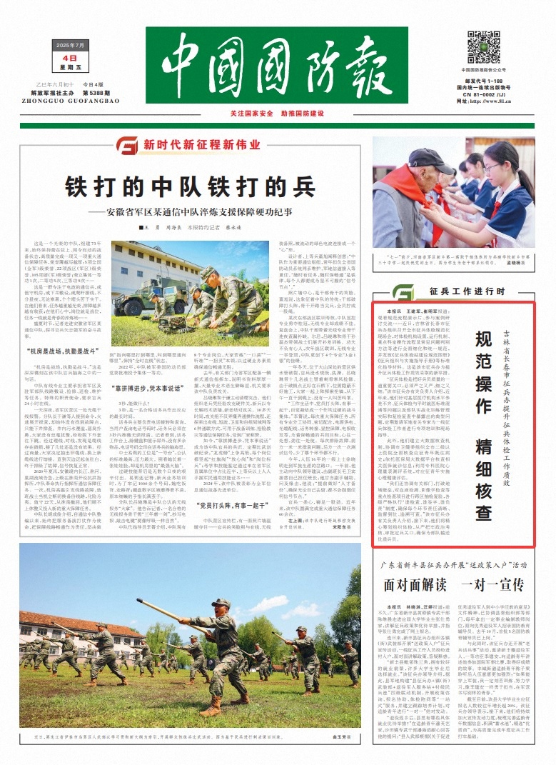 “征兵体检是把好兵员质量的一道重要关口,必须严之又严、细之又细。”该市征兵办有关负责人介绍,近年来,他们针对基层医疗机构水平参差不齐、征兵体检与平时就医标准混淆等问题以及部队实战化训练管理实际和复检复查中暴露出的典型问题,定期邀请军地有关专家为一线征兵体检工作者进行专项培训和现场指导。