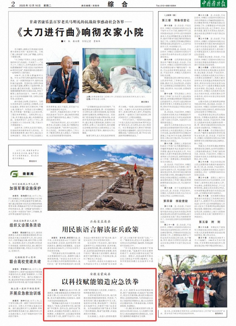 中国国防报讯 郁清报道:皖北平原,寒意渐浓,安徽省蒙城县民兵训练场内却战意正酣:无人机实时回传“火场”影像,单兵终端秒级响应处置指令,指挥大屏动态标绘救援态势。