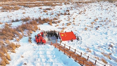 经过一上午跋涉,师生代表与官兵抵达界碑。“这就是祖国陆地最东点!”带队干部于成成话音刚落,大家按捺不住内心的激动,大步向前。清华大学人文学院学生秦一筹俯下身,擦拭界碑上的积雪与冰痕。师生们与官兵共同展开五星红旗,庄严宣誓:“四海同心,梦绘朝阳;希望如歌,青春飞扬;追逐梦想,心向光芒!”