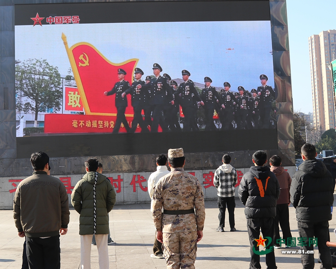 习水县征兵办在街道广场播放征兵宣传片。(刘远懋 摄)
