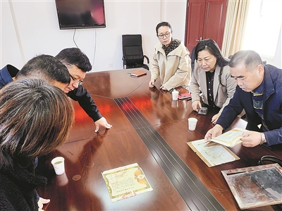 晋冀鲁豫烈士陵园工作人员和烈士后代梅忠圆(右一)等核对相关信息确认亲属关系。魏子妍摄