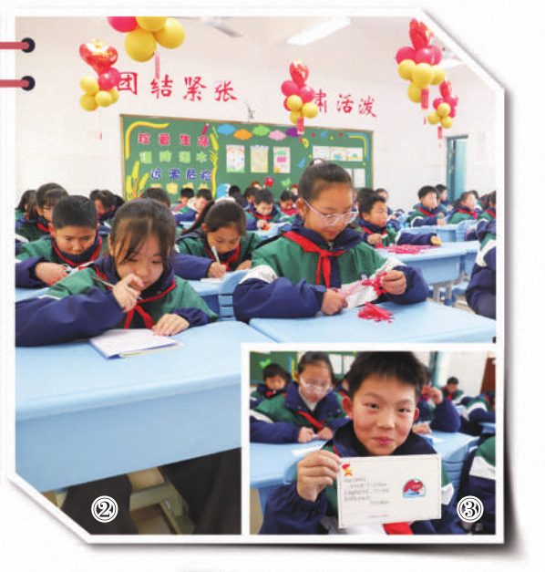 图②:江西省庐山市第四小学学生为海军庐山舰官兵制作春节慰问礼物。付佳幸子摄;图③:庐山市第四小学学生分享手写的明信片。付佳幸子摄