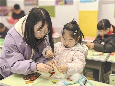 社区志愿者在军娃托管站指导军娃做手工艺品。朱 琳摄