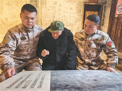 春节前夕,89岁的江西省乐安县万崇镇池头村村民邱希仁给老宅贴上红彤彤的春联。看着鲜亮的春联和泛黄的标语,老人讲述起一段跨越90载、延续4代人的守护故事。