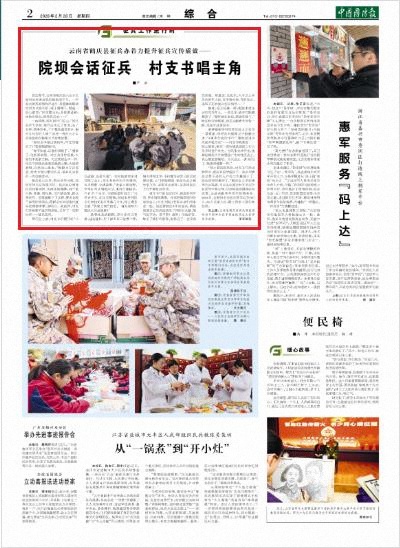 鹤庆县山区多,群众居住分散,传统宣传方法效果不好。县征兵办领导沉到村里调研,思路逐渐清晰:村干部人熟、地熟、情况熟,他们讲政策,群众喜欢听。县里随即下了文件,要求各级干部用好院坝会,跟群众面对面地把征兵政策讲清楚、说明白。就这样,村民们再熟悉不过的院坝会,又多了一项新内容——征兵宣传。