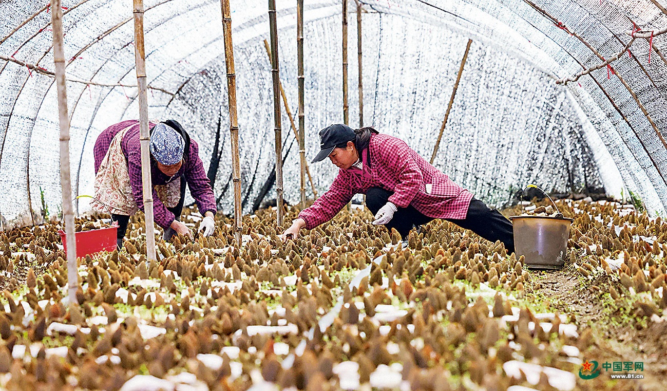 鱼塘村村民在羊肚菌种植大棚内劳作。胡攀学 摄