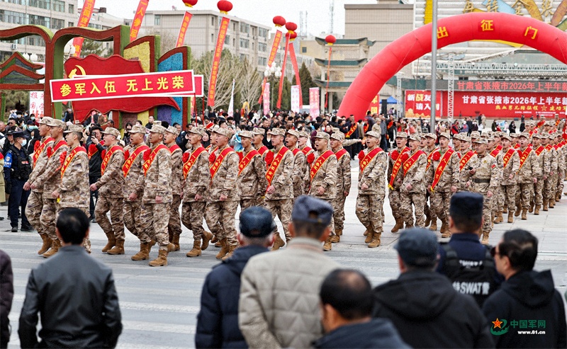 2026年3月16日,甘肃省张掖市举行新兵入伍欢送仪式。百余名新兵胸戴红花、身披绶带,精神昂扬、整齐列队。现场依次展开新兵宣誓、授装出征、集体欢送等庄重仪式,各界群众为新兵敬献哈达,对他们致以诚挚祝福。