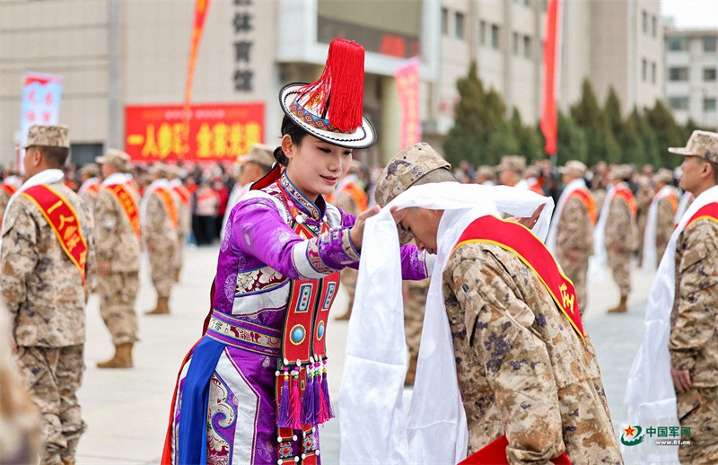 肃南裕固族自治县的群众为新兵们献上圣洁的哈达。侯崇慧 摄
