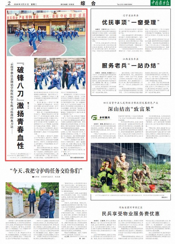 课间操结束,几名满头大汗的学生放下木刀围拢在一起休息。五年级学生何仕宇抹着汗兴奋地说:“以前只在电视里听过《大刀进行曲》,没想到自己能学到相关刀法。我一定锻炼好身体,长大了去当兵保卫祖国!”六年级学生李安的曾祖父是抗战老兵,家中还珍藏着一枚军功章。“每次练习刀法,我都感觉热血沸腾。”李安深有感触地说,“我要好好学习、练好本领,把抗战精神传下去。”