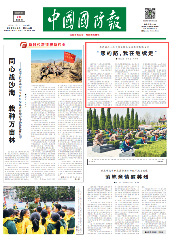 那次回舒兰,周义航在人武部营区外墙宣传栏看到,一个小朋友指着父亲的照片向同伴介绍:“我知道这位叔叔,他是大英雄!”那一刻,他眼眶湿润。小时候,他常把“我爸是军人”挂在嘴边。彼时,这句话带给他的是自豪,而今,他真正读懂了其中的分量。