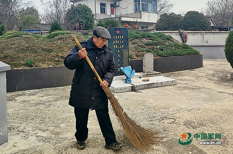 童传家在新四军五烈士墓园中清扫。刁振山 摄