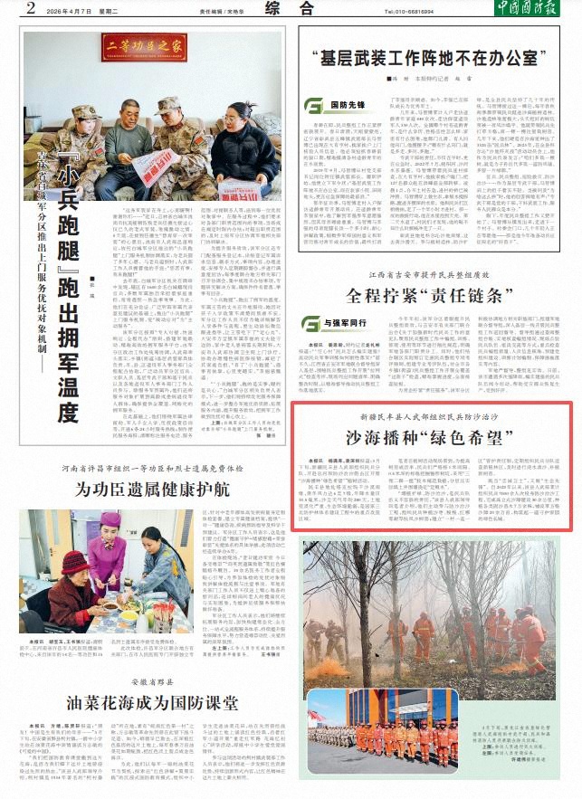 “增植扩绿、防沙治沙,是民兵队伍义不容辞的责任。”该县人武部领导向笔者介绍,他们主动参与防沙治沙工程,组织民兵种植沙枣、梭梭、红柳等耐旱抗风沙树苗;建立“一村一连一区”管护责任制,定期组织民兵分队巡查新植林区,及时进行浇水清沙、补植新树苗。