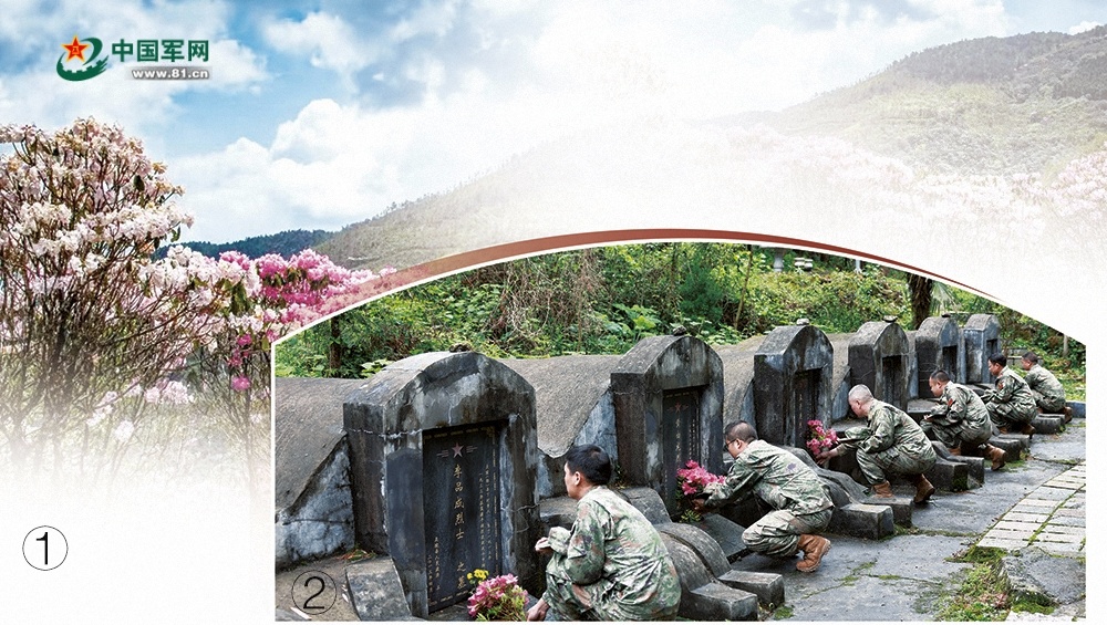图①:湖南省炎陵县下村乡大横溪村村道旁的杜鹃林;图②:4月17日,前来走访的湖南省炎陵县人武部官兵到大横溪村红军烈士墓园敬献鲜花。