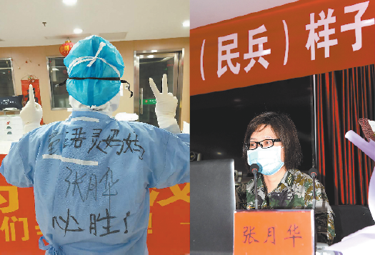 上图为张月华身着防护服在抗疫一线支援。右图为张月华正在人武部做报告。周晓明摄