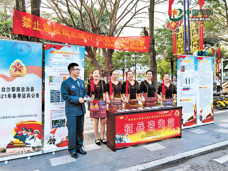 今年春季征兵工作开展后,为了让黎族群众更加深入了解征兵优惠政策,白沙县人武部在做好线上线下征兵宣传发动工作的同时,结合当地黎族群众喜欢山歌对唱的特点,协调当地黎歌协会等组织,紧紧围绕“参军光荣”这一主题,创作了一系列具有时代气息、兵味十足的山歌,歌词奋进新颖、旋律铿锵有力,唱响了黎族男儿立志保家卫国的英雄气概。
