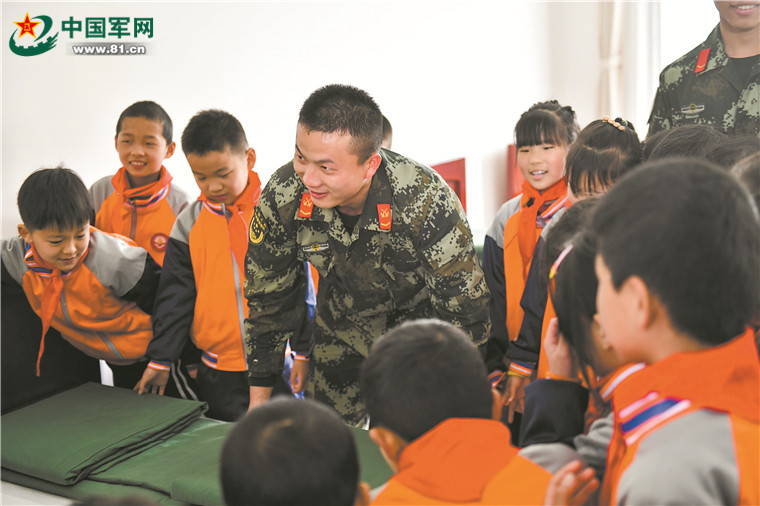 战士教学生叠军被。 张可煜 摄