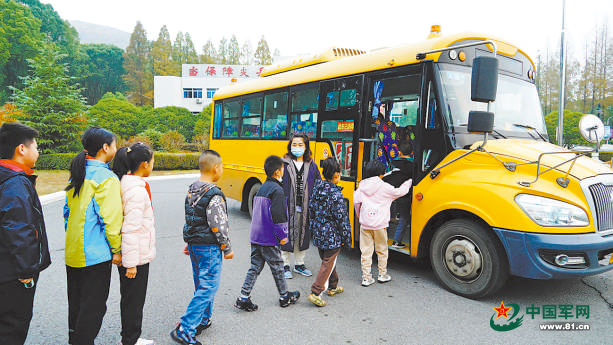 某部官兵子女有序登上校车。