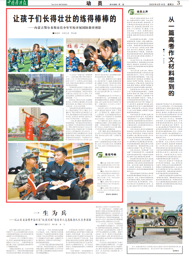 一方面,着力提高“国防教育讲堂”的授课质量。“我们通过讲好故事的办法,增强孩子们的国防观念和家国情怀。”鄂尔多斯军分区政治工作处主任贾铁彬介绍说,军地相关部门不仅梳理出历史上的英雄故事,而且对杜宏、王磊等新时代鄂尔多斯籍革命烈士的事迹进行梳理,并将地方党委、政府对其家庭的优待优抚细节一并讲给孩子们听,使同学们认识到“烈士身许国,全民尊其家”的社会责任,进而增强对国防事业的思想认同、情感认同。