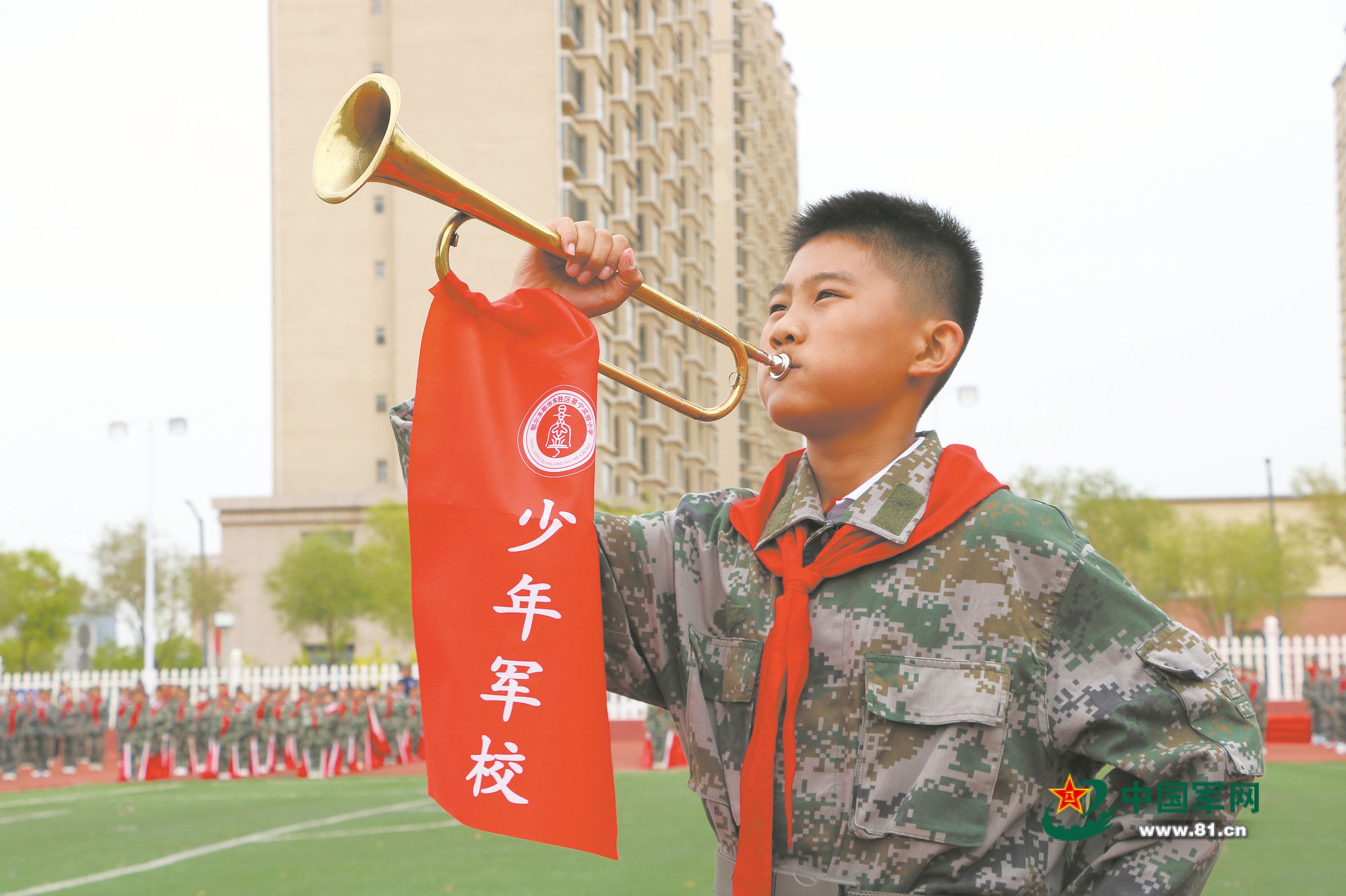 内蒙古鄂尔多斯市东胜区景宁实验小学少年军校军乐队队员吹响军号。蒋世伟、杨建荣摄