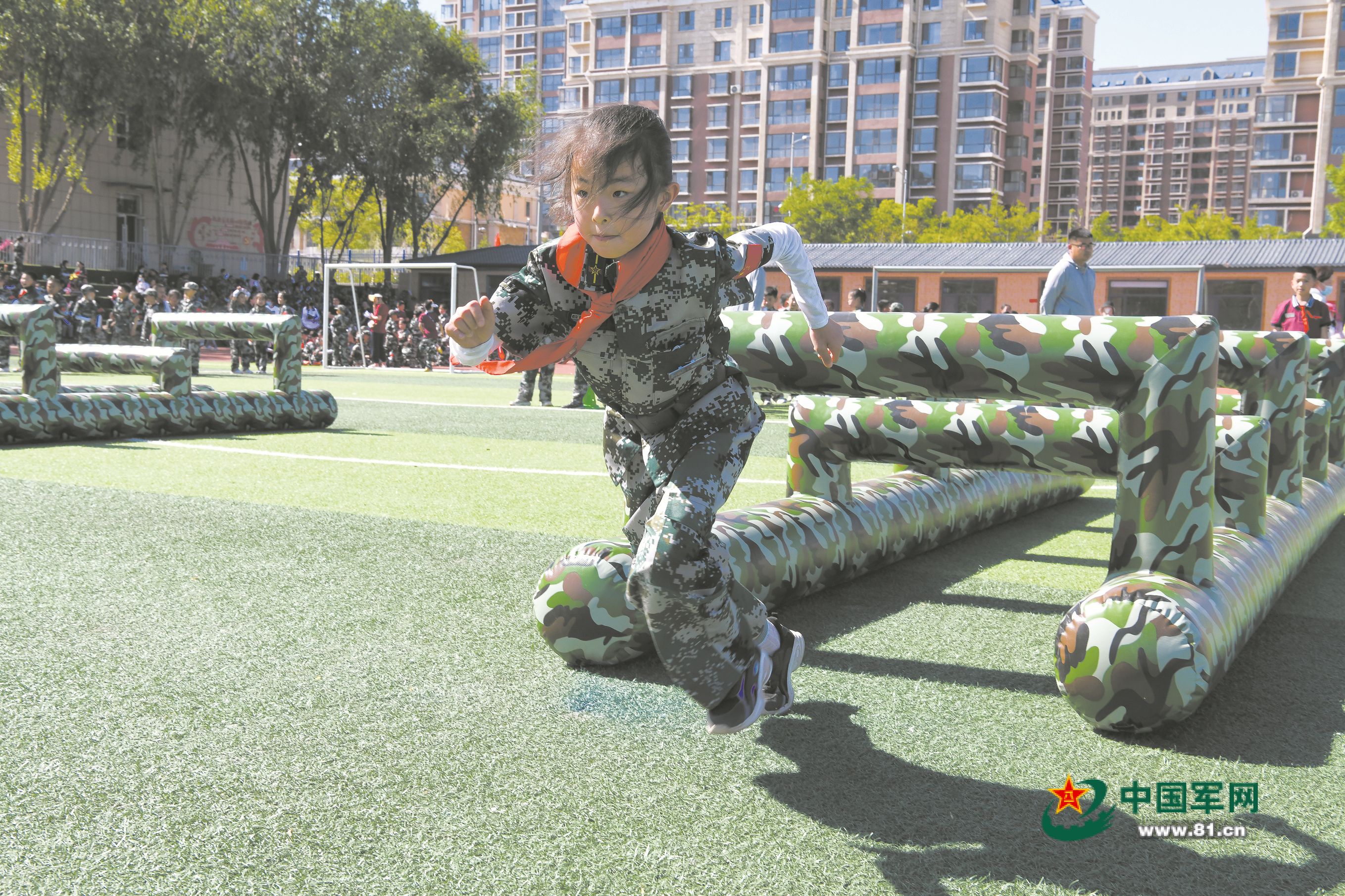 内蒙古鄂尔多斯市10所少年军校普遍举办军事体育运动会,锤炼学生意志品质。图为康巴什区第三小学一名学生参加“穿越火线”比赛项目。蒋世伟、杨建荣摄
