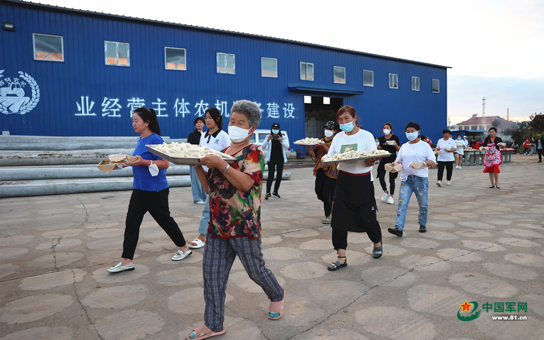 舒兰市开原镇保安村村民为战士送上热水饺。