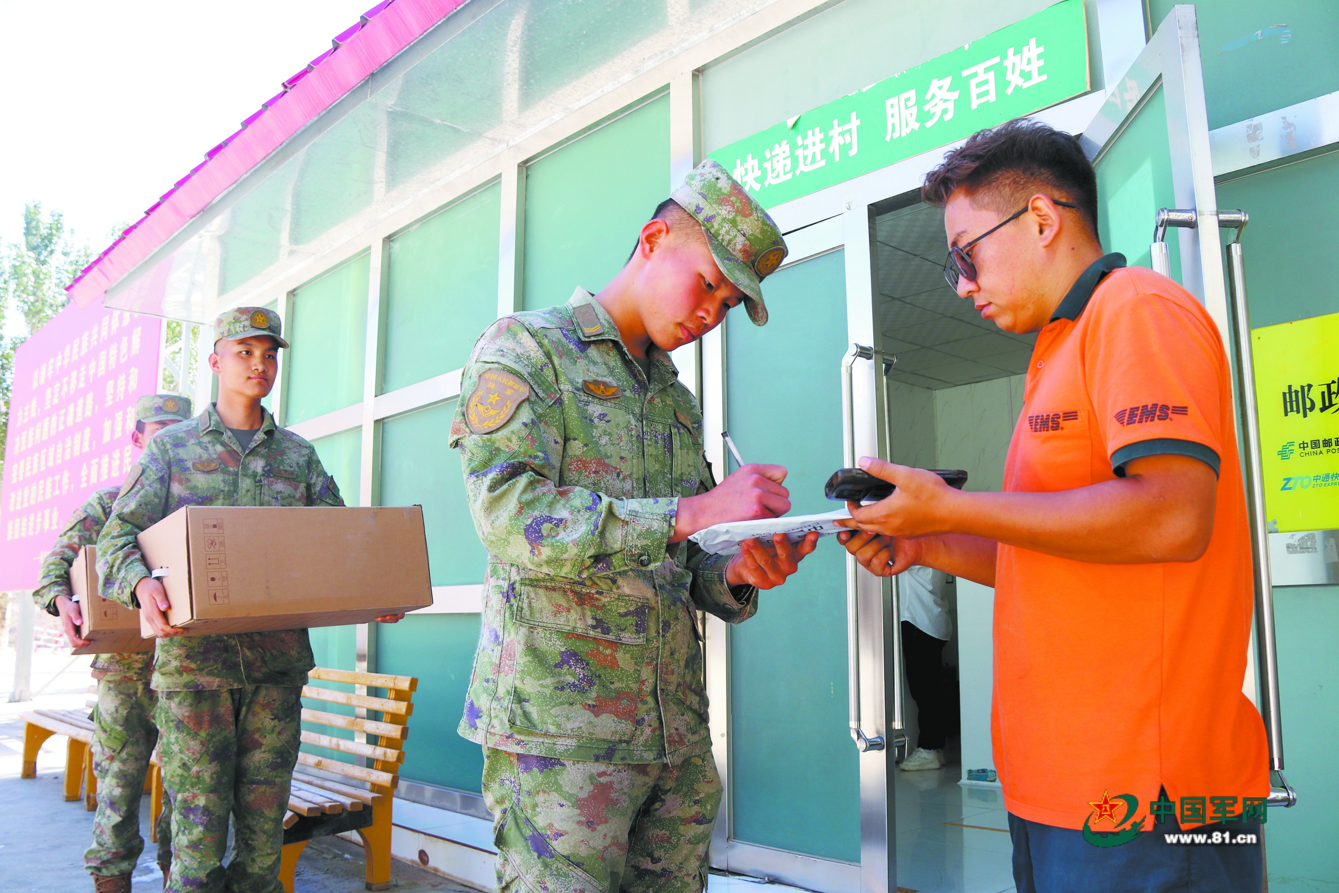 新疆军区迈丹边防连官兵在营区门口的快递点领取快递。马庚赟摄
