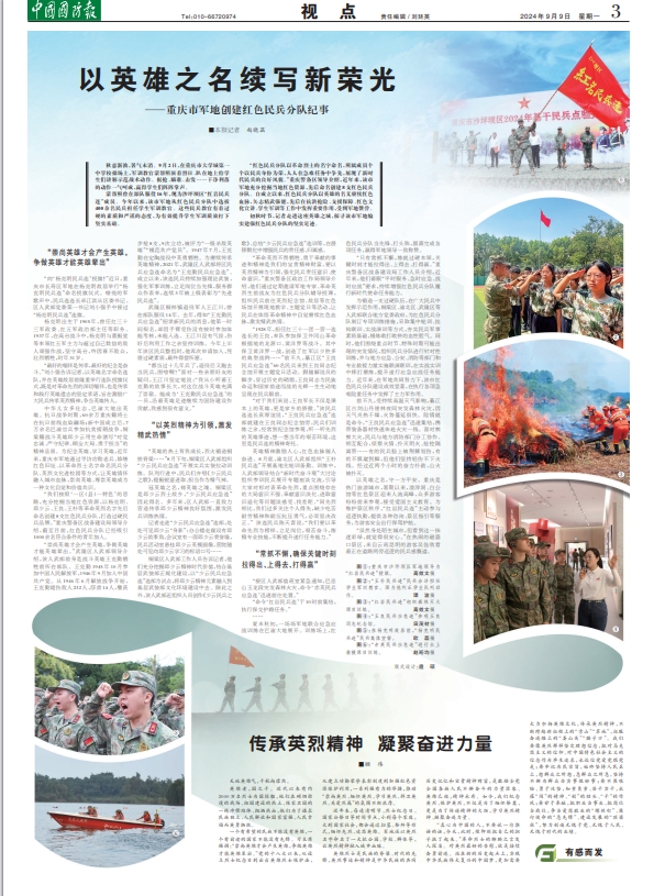 “革命英烈不畏牺牲、勇于奉献的事迹和精神是我们的宝贵精神财富,要以英烈精神为引领,强化民兵责任意识、使命意识。”重庆警备区政治工作局领导介绍,他们通过定期邀请军地专家、革命英烈生前战友为红色民兵分队辅导授课,组织民兵前往英烈纪念馆、故居等红色场馆开展现地教学、主题党日等活动,让民兵在体悟革命精神中自觉赓续红色血脉,激发精武热情。