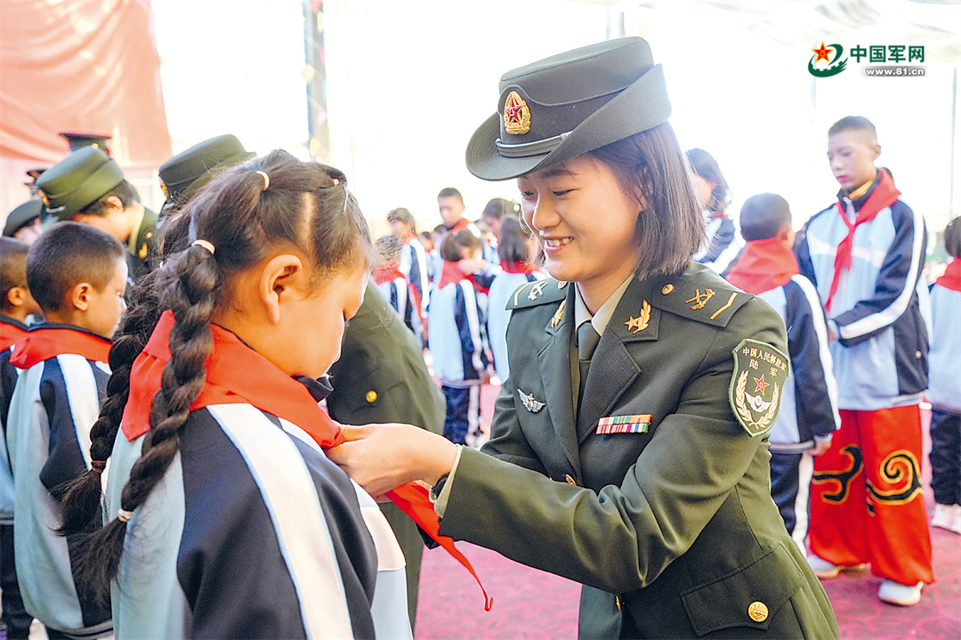 官兵为新入队少先队员佩戴红领巾。李江 摄