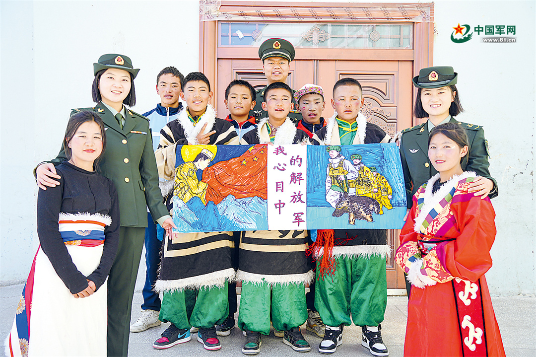 官兵与学生合影留念。李江 摄