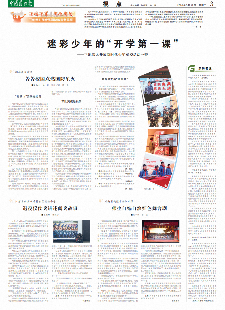 本期,我们遴选三地少年军校的“开学第一课”活动,感受当地创新教育方式引导青少年学生增强国防观念、掌握国防知识、提高国防技能、强健意志体魄,争当爱党爱国、勤奋好学、全面发展的新时代好少年的生动实践。