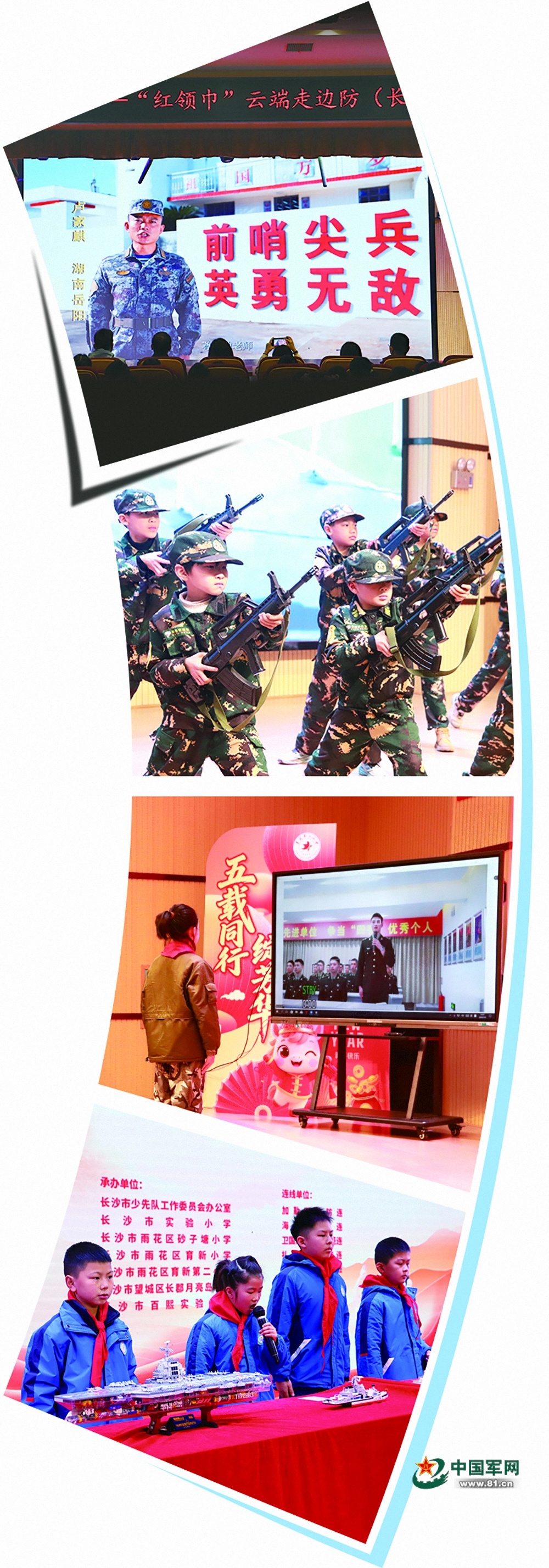 图①:“红领巾”云端走边防活动现场,湖南省长沙市实验小学学生聆听海防战士视频寄语。颜 美摄 图②:湖南省长沙市雨花区育新第二小学“幼狼特战队”进行战术演示。李招弟摄 图③:在视频连线中,湖南省长沙市雨花区育新第二小学学生和官兵互动对话。李招弟摄 图④:湖南省长沙市实验小学学生代表展示手工制作的舰艇模型。颜 美摄 制图:扈 硕
