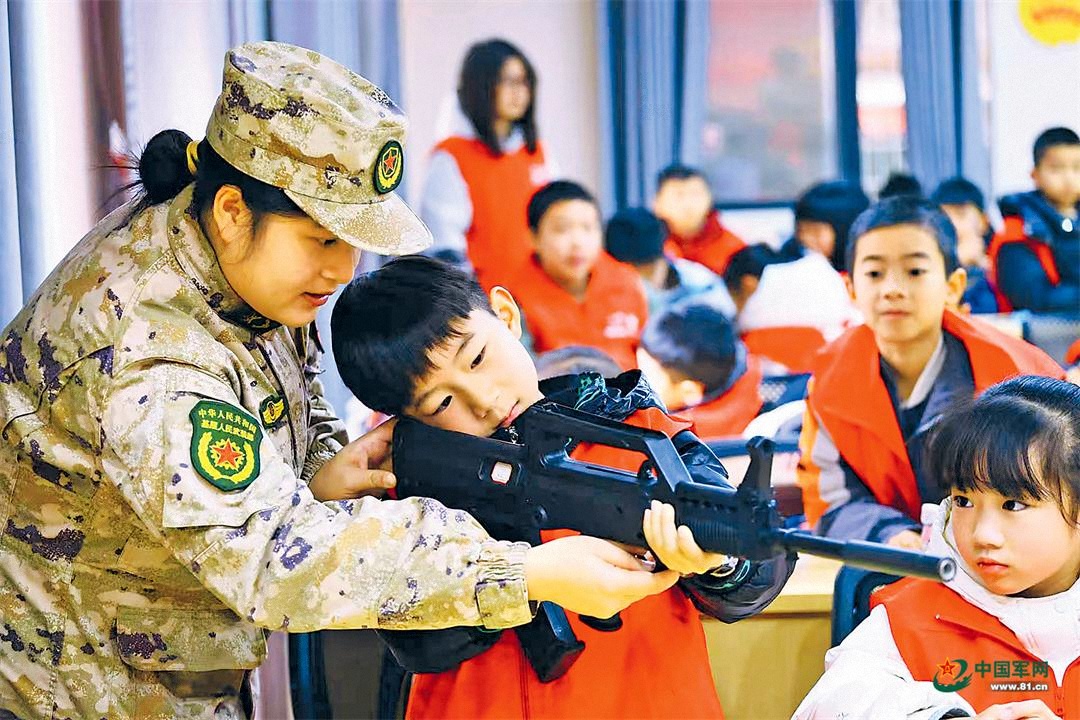图为工作人员指导儿童体验枪支模型。柴均林 摄