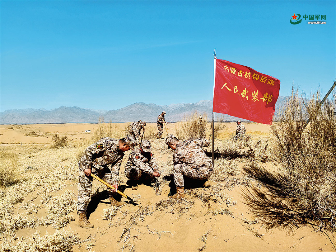进入20世纪90年代,杭锦后旗人武部持续发力,组织民兵队伍更加集中、持久地向黄沙宣战。广大民兵常年奋战在治沙一线,铺草方格、栽沙枣树、埋设沙障,日复一日与风沙较量。