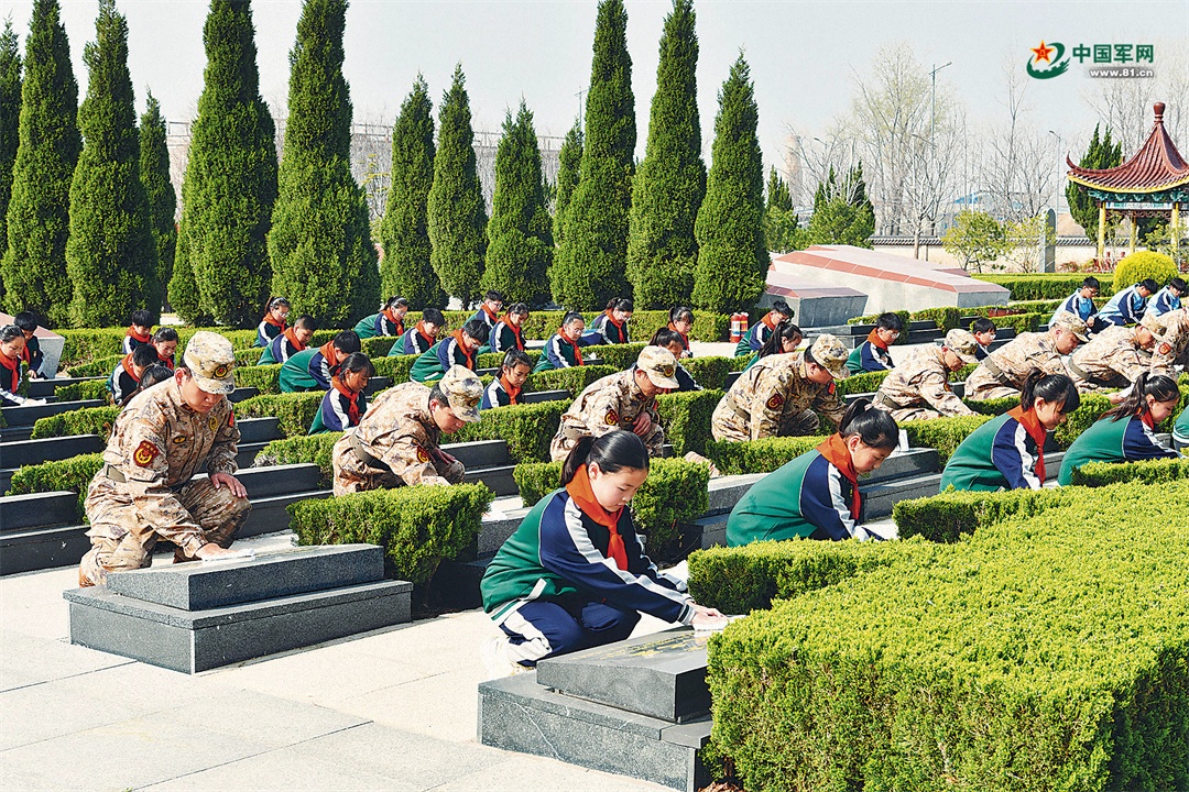 图为民兵和学生一起擦拭烈士墓碑。李金春 摄