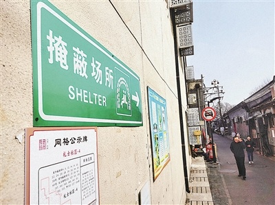 清明时节,北京市隆福寺文化街区熙熙攘攘、人流如织。细心的游客发现,街区四周小巷入口处都挂着疏散掩蔽标识牌,牌子上蓝色的人防工程示意图十分醒目。