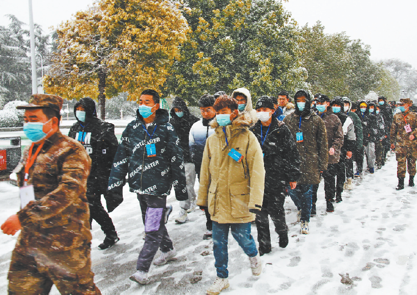 中国国防报讯 刘海涛、王磊摄影报道:2020年12月29日,江苏徐州突降大雪、气温骤降。寒冷挡不住青年参军报国的热情,中国矿业大学学生刘帅和近两百名同学一起,顶风冒雪来到第七十一集团军医院体检中心,参加2021年春季征兵体检(上图)。
