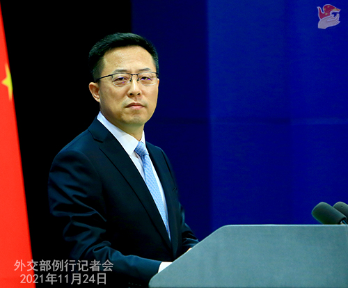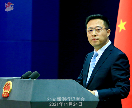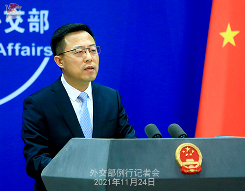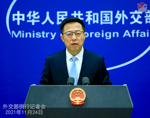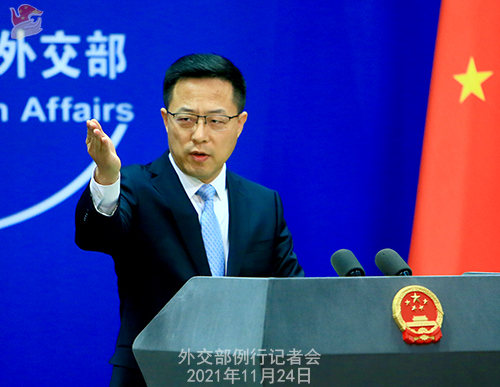 赵立坚:中方坚决反对美方邀请台湾当局参加所谓“领导人民主峰会”。世界上只有一个中国。中华人民共和国政府是代表全中国的唯一合法政府,台湾是中国领土不可分割的一部分。一个中国原则是公认的国际关系准则。台湾除了作为中国的一部分,没有别的国际法地位。我们严正敦促美方恪守一个中国原则和中美三个联合公报规定,停止向“台独”势力提供任何讲台,停止为“台独”势力张目。为“台独”势力搭台,只会让自己下不来台。与“台独”一起玩火,终将引火烧身。