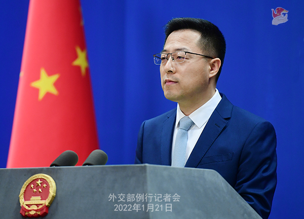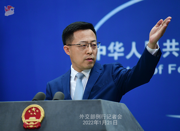 赵立坚:1月20日,王毅国务委员兼外长同德国新任外长贝尔伯克举行视频会晤。这是德国新政府上任后两国外长的首次接触。双方在1个半小时里就中德关系、中欧关系等丰富议题深入交流,达成一系列共识。