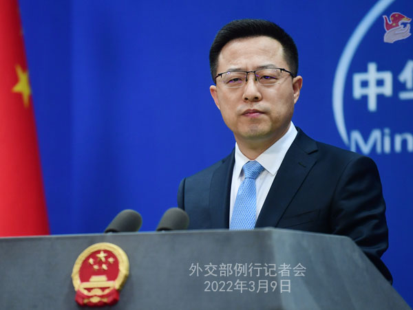 赵立坚:中国红十字会已经发布消息。应乌克兰方面请求,中国红十字会将向乌克兰红十字会提供一批人道主义援助物资,包括食品、生活必需品等,价值500万元人民币。3月9日,首批物资已经从北京启运,后续将通过适当方式尽快交付乌克兰红十字会。