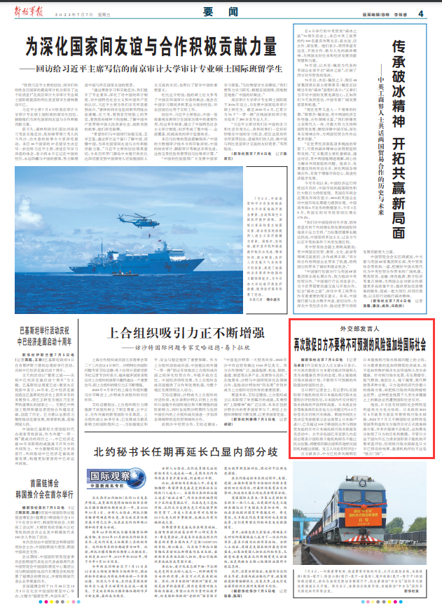 据新华社北京7月6日电 (记者马卓言)外交部发言人汪文斌6日表示,中方再次敦促日方本着对海洋环境和人类生命健康负责任的态度,停止强推核污染水排海计划,不要将不可预测的风险强加给国际社会。