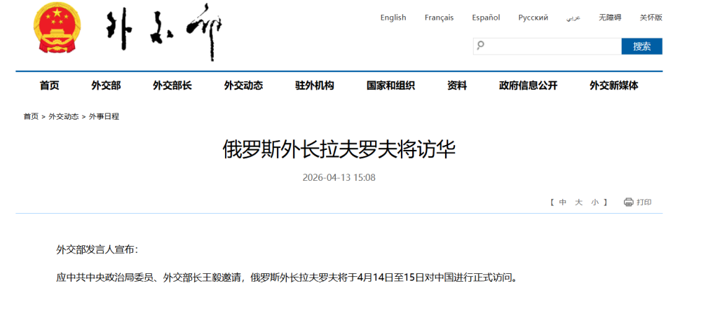 应中共中央政治局委员、外交部长王毅邀请,俄罗斯外长拉夫罗夫将于4月14日至15日对中国进行正式访问。