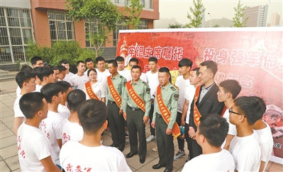 近日,河北省承德市征兵办再次邀请承德籍优秀军人代表、退役士兵代表组成事迹报告团,深入大专院校和县(市、区)巡回宣讲,有效激发了适龄青年参军热情。图为“时代楷模”王锐(中间站立者)等5名报告团成员来到院校为大学生宣讲征兵政策。曹 明摄