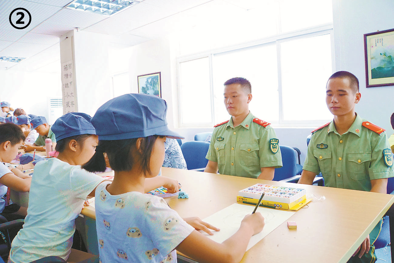 图②、③为建军节到来之际,湖南省张家界市武陵源区消防官兵和一群爱好美术的小朋友聚在一起。小朋友手持画笔、画板,用缤纷的色彩,描绘出心目中的救火英雄,为消防官兵送上节日礼物。王登超、杜修庆摄影报道