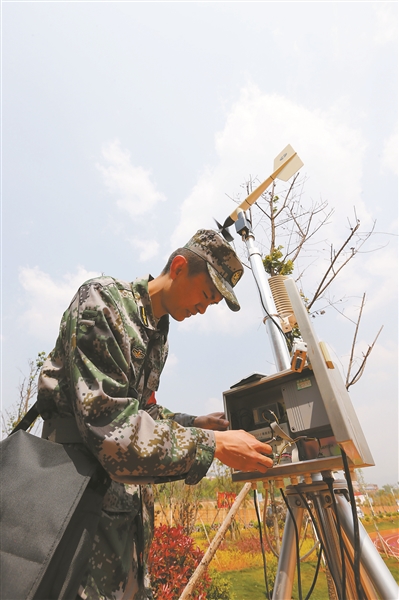 左上图:民兵气象专业分队队员调试设备。熊海青摄